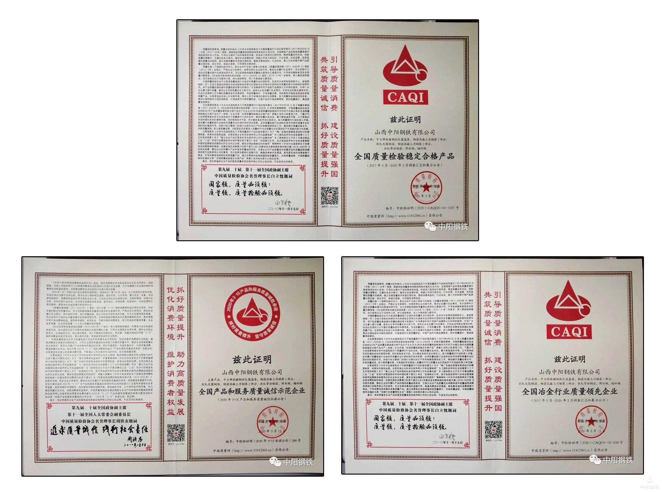 日前,在2020年3·15国际消费者权益日“产品和服务质量诚信承诺”主题活动中,中阳钢铁被授予“全国冶金行业质量领先企业”“全国产品和服务质量诚信示范企业”“全国质量检验稳定合格产品”等3项殊荣。