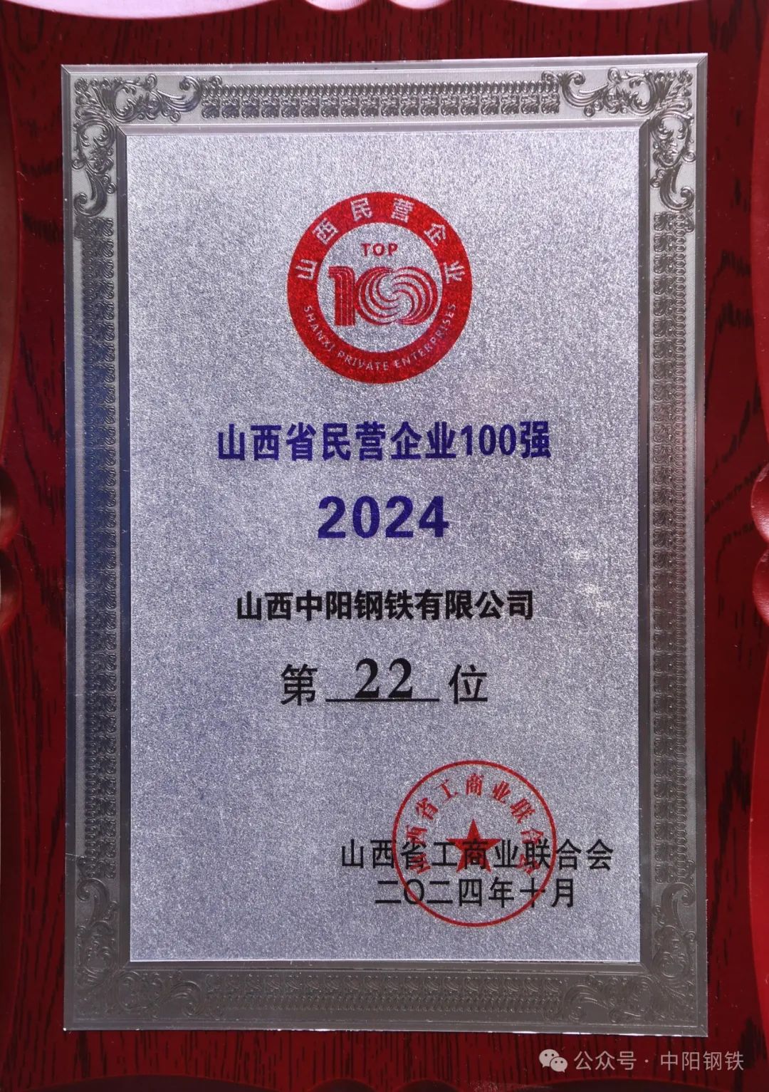 10月13日,在“万企兴万村”山西行动现场推进会暨民营企业助力县域经济高质量发展大会上,省工商联发布了“2024山西省民营企业100强”“2024山西省民营企业制造业30强”“2024山西省民营企业服务业20强”系列榜单。中阳钢铁榜上有名,以营收1219966万元位列“2024山西省民营企业100强”第22位、“2024山西省民营企业制造业30强”第18位。